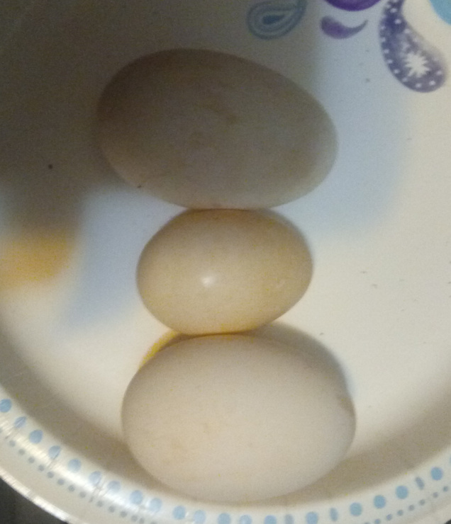 If you have never seen goose egg before to see the size comparison is very different. The egg in the middle is from my chicken. Just to give you a reference.