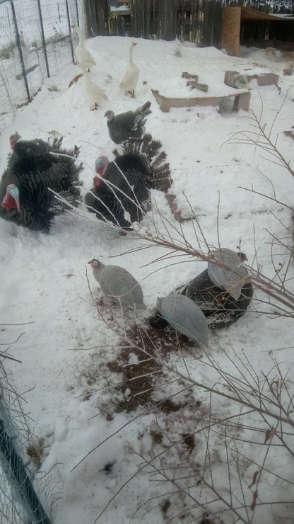 Talk a taking advantage of a situation. The Guinea fowl is standing on the turkeys back to keep its feet out of the snow. The tree is the back side of my bird coop. The horse comes to visit just about every day it keep a distance though.