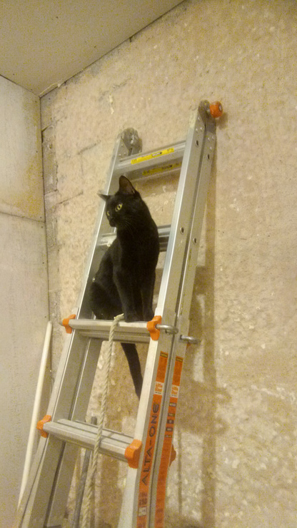 The bathroom where the ceiling caved in is still under construction (Raven) decided to have a look around at my handy work.