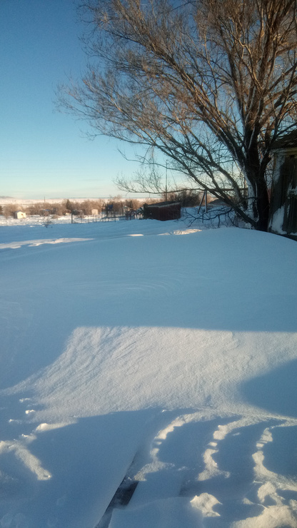 I took a photo of how hard the wind blew and piled the snow. I was feeding my birds and by chance, I had looked out in my field. I had seen my dogs tail shimmer around the corner of the 5-foot fence. Had to fetch the dogs as I am looking for them ...