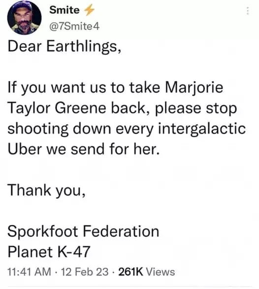 Two aliens landed in the Arizona desert near a gas station that was closed for the night. They approached one of the gas pumps and the younger alien addressed it saying, “Greetings, Earthling. We come in peace. Take us to your leader.” The gas...