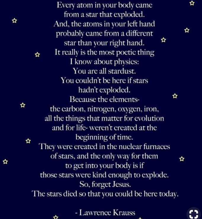 THANK YOU for expanding my brain today! HAHAHA! I Have an introverted brain...it takes longer for ideas to percolate through the coffee grounds in my brain! I knew I was made of stars; but now that I realize that I will create new stars!!!?????? SO FREAKING HAPPY! I like being Star FODDER!! EXCELLENT!!