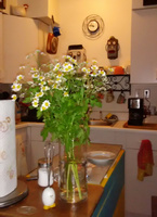 I spent $3.99 at Trader Joe's for something enjoyable and lovely to put in my home. I'm always in my kitchen, so there they sit by the paper towels. I love having cut flowers around the house. If you are fortunate enough to have a flower market in your town, I encourage you to get out of that robe, and go buy yourself some flowers.