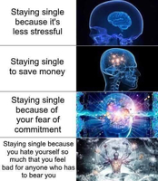 Actually for the last few years it has been less stressful for me to be alone. I really did not have the band with to put in a relationship. Cheaper? I don't know. I'm not afraid of commitment. And I am actually a great person so the last one does not apply.