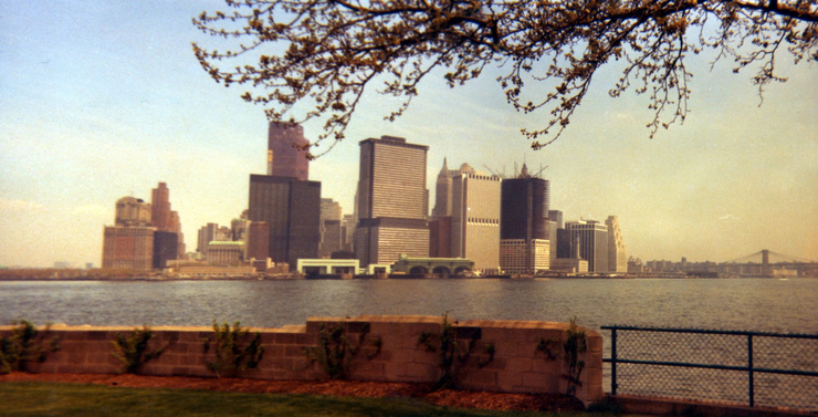 The WTC towers under construction, as seen from Governors Island, 1971