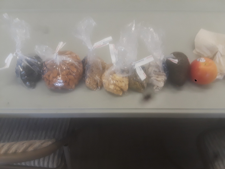 *prunes, almonds, sunflower seeds, favas beans, pepitas, coconut, avocado and an apple