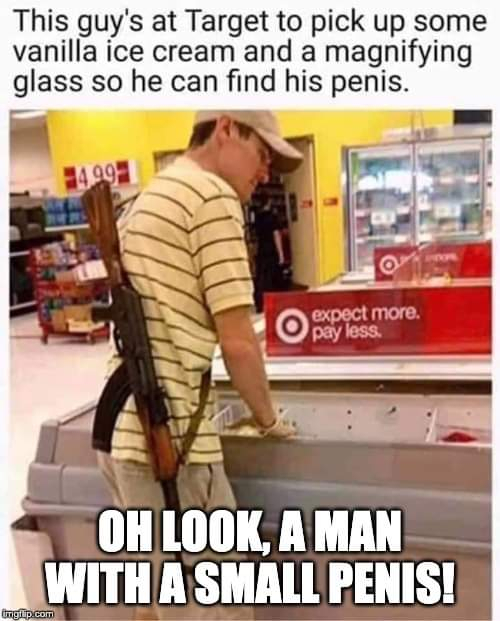"Small penis" is a cute way to attack these imbeciles, but a more accurate description is "INSECURITY." I see it every day, while riding my motorcycle. Not guns (although it amounts to the exact same thing), but huge, and I mean HUGE, Trump signs on peoples' lawns. The bigger the sign the deeper the insecurity. I saw one yesterday that made me laugh so hard I almost crashed my bike! At first glance I thought it said, "TRUMPHANT"! I was like, WTF is a #TRUMPHANT! On a second glance I saw that this IDIOT had put a RED "I" after the "R" and a red "HANT" after the "P"! Get it!? TR"I"UMP"HANT"! I need to go back and get a photo of THAT work of "art!" Hahahaha!!