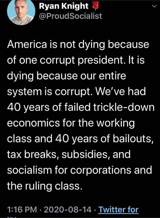 @WilliamCharles Biden won't actively dismantle climate regulations to own the libs or install hundreds of judges from groups like "people of praise" or Q. Hes a politician. Also obviously Trump is not the whole problem with the country. There is a huge difference though. If you can't see I don't know what to say.