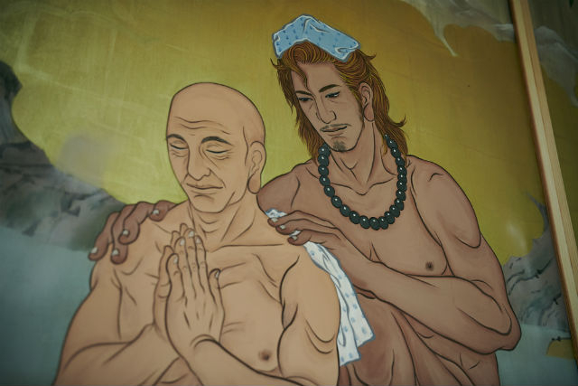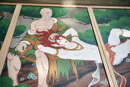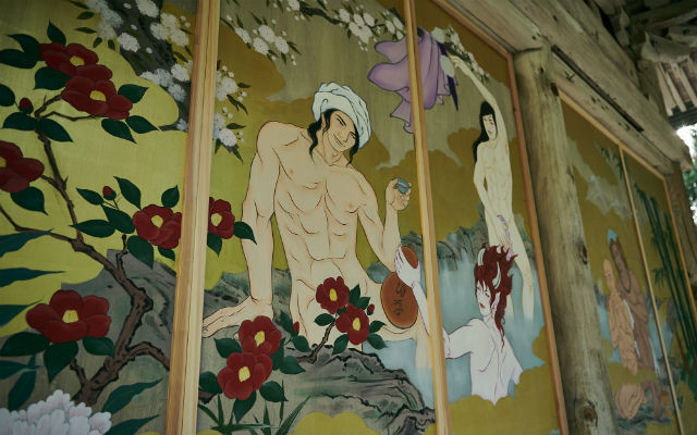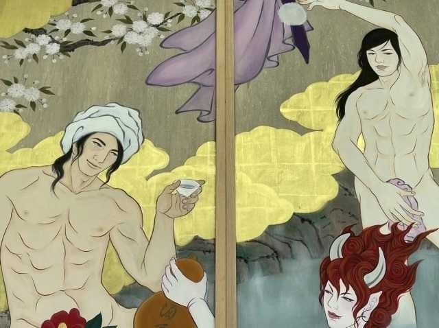 In an attempt to attract younger visitors, particularly women to its grounds, Kokujoji Temple in Niigata Prefecture has installed panels of an art series titled โIkemen Kanno Emakiโ (Scroll of Handsome and Sensual Men) within the temple. Head priest Kotetsu Yamada says that he wants to dispel the old-fashioned and boring image of the temple to appeal in particular to young women, and so the temple has teamed up with Kyoto-born artist Ryoko Kimura to create scrolls of art depicting five famous historical and mythical figures -- bathing naked together.