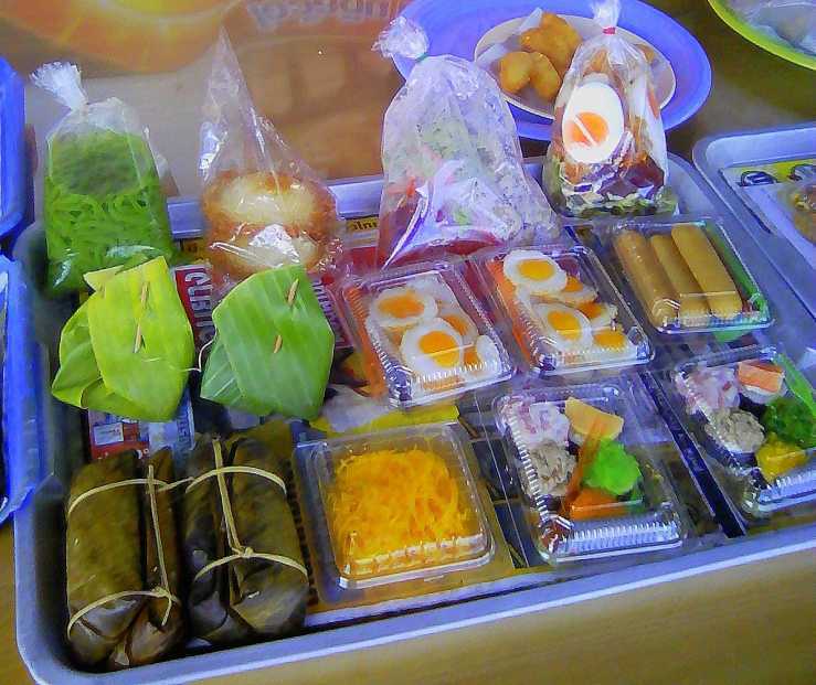 5.tray of snacks for sale, including two banana leaf sticky rice rolls in the bottom left corner