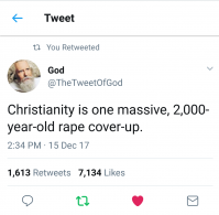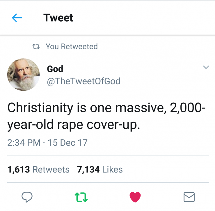 An interesting take (I love God @TheTweetOfGod), but I don't believe the historical Jesus either believed or claimed to have been born of a virgin. I believe that was a later fiction probably concocted to either beef up the claims of his biographers that he was divine, or to whitewash his illegitimate birth, or most likely, both.