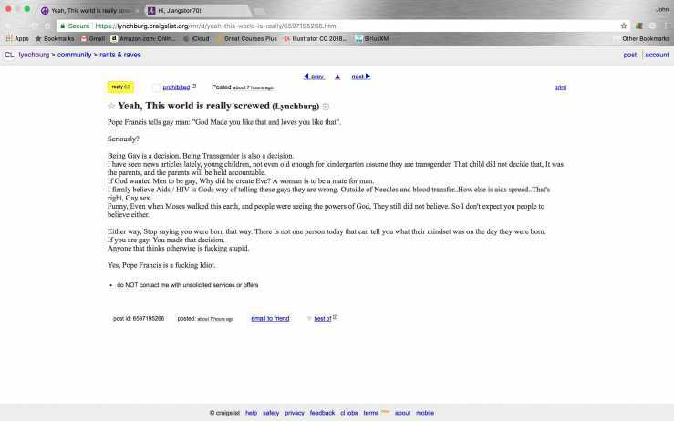 From the Lynchburg, VA Craigslist Community section: